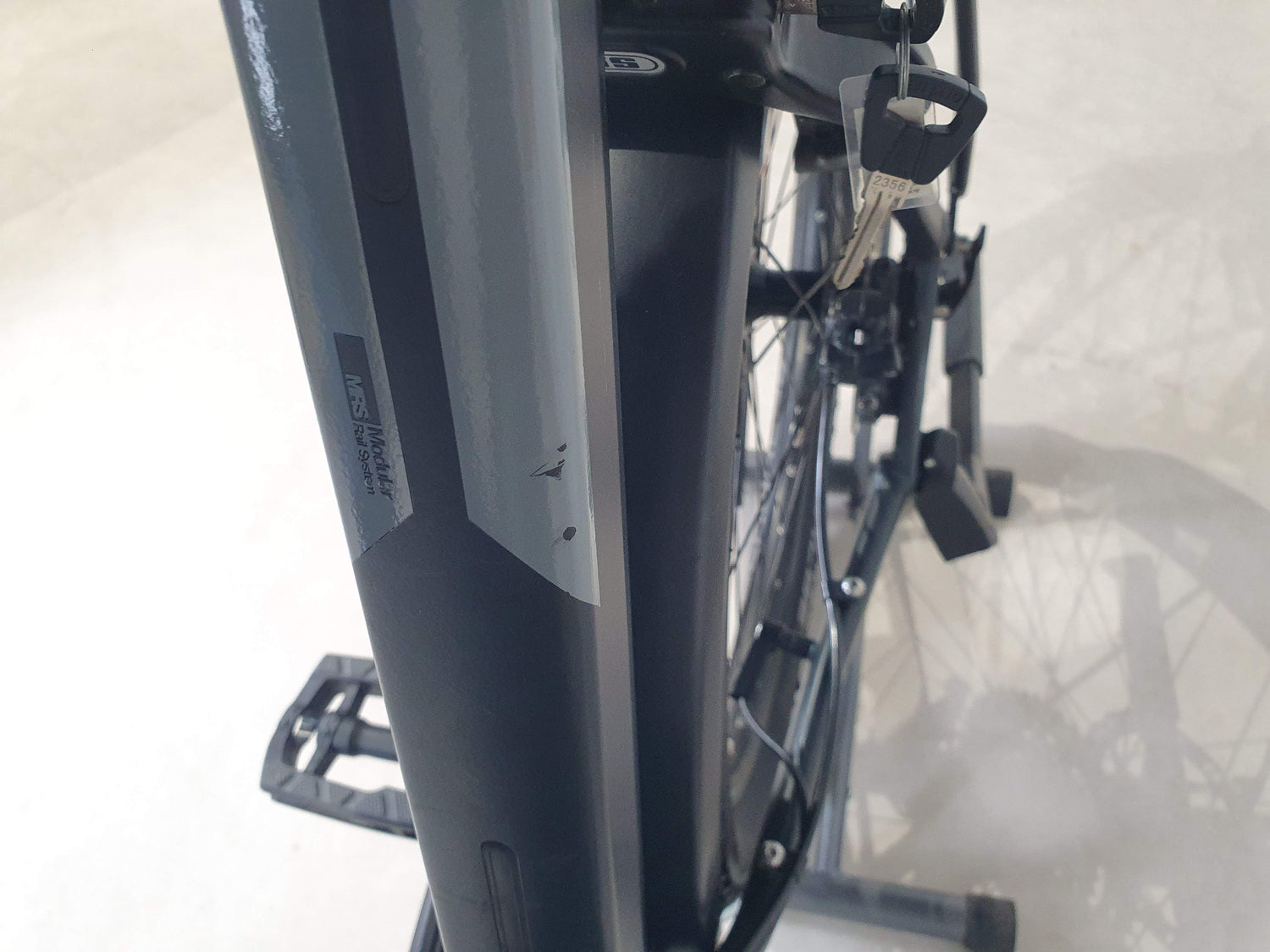 Le vélo est livré prêt à rouler, à l'exception des pédales à revisser et du guidon à tourner. Il contient le chargeur et les clés de la batterie, ainsi que tous les accessoires visibles sur les photos.